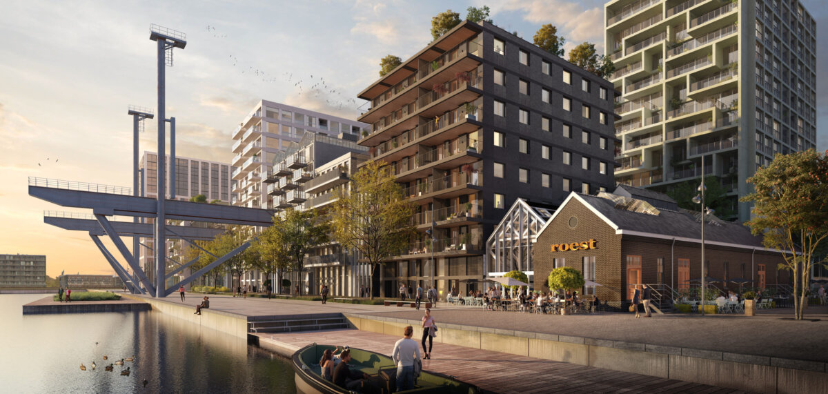 In the coming years, Oostenburg will be developed into a new lively city district with around 1800 homes. There will be a nice mix of social, mid-range and free-sector rental homes, owner-occupied apartments, self-build homes, relaxation areas, hospitality and business. The historic core of Oostenburg is preserved, in the form of the 19th-century “Van Gentdhallen”, the monumental “Werkspoorhal”, the old quay walls and the iconic blue crane stands of Werkspoor.