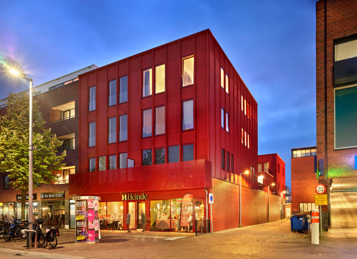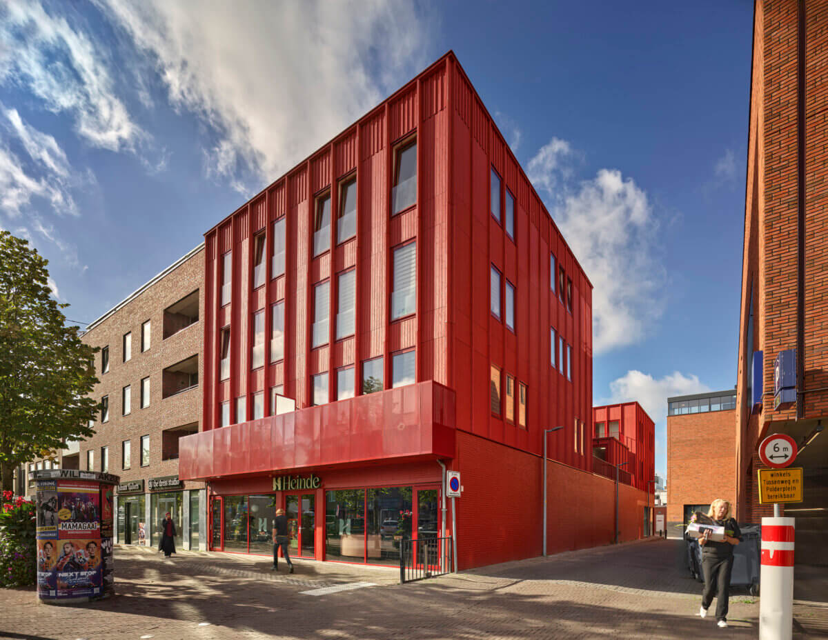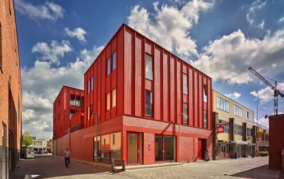 Dit nieuwe prachtige gebouw bestaat deels uit rode houten latjes en langwerpige ramen. Een trap leidt vanaf de begane grond naar het dak van de winkel. Daar ligt een binnentuin en begint de eerste woonlaag. Vanaf daar zijn alle voordeuren te bereiken. Van de tien vrije sector woningen zijn er vier met een oppervlakte van ongeveer 50 vierkante meter. De oppervlaktes van de andere zes woningen liggen tussen de 75-80 vierkante meter. De woningen zijn elk voorzien van een ruim balkon en worden hoogwaardig afgewerkt. De commerciële laag van het gebouw is nog niet opgeleverd. Het achterste deel van de eerder bestaande winkel is gebruikt voor de realisatie van een fietsenberging, een trap en een algemene ruimte. Het ontwerp van Ronald Janssen Architecten geeft de hele straat meer cachet.