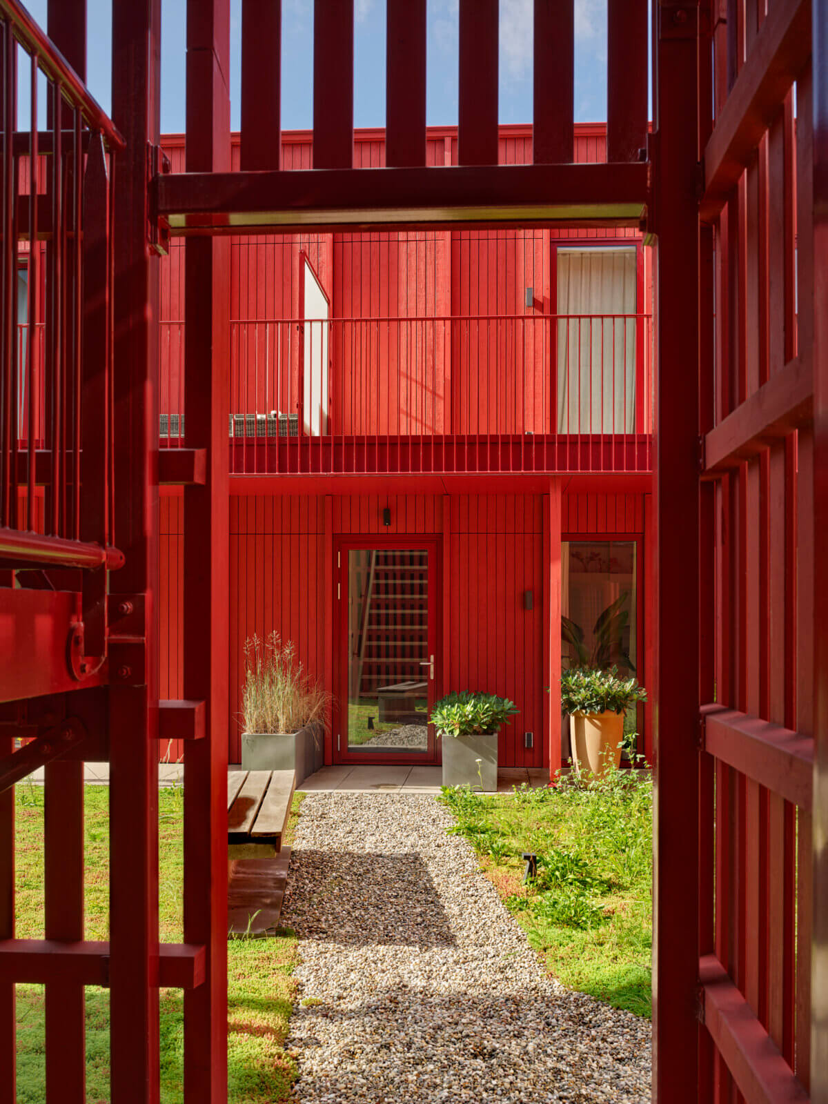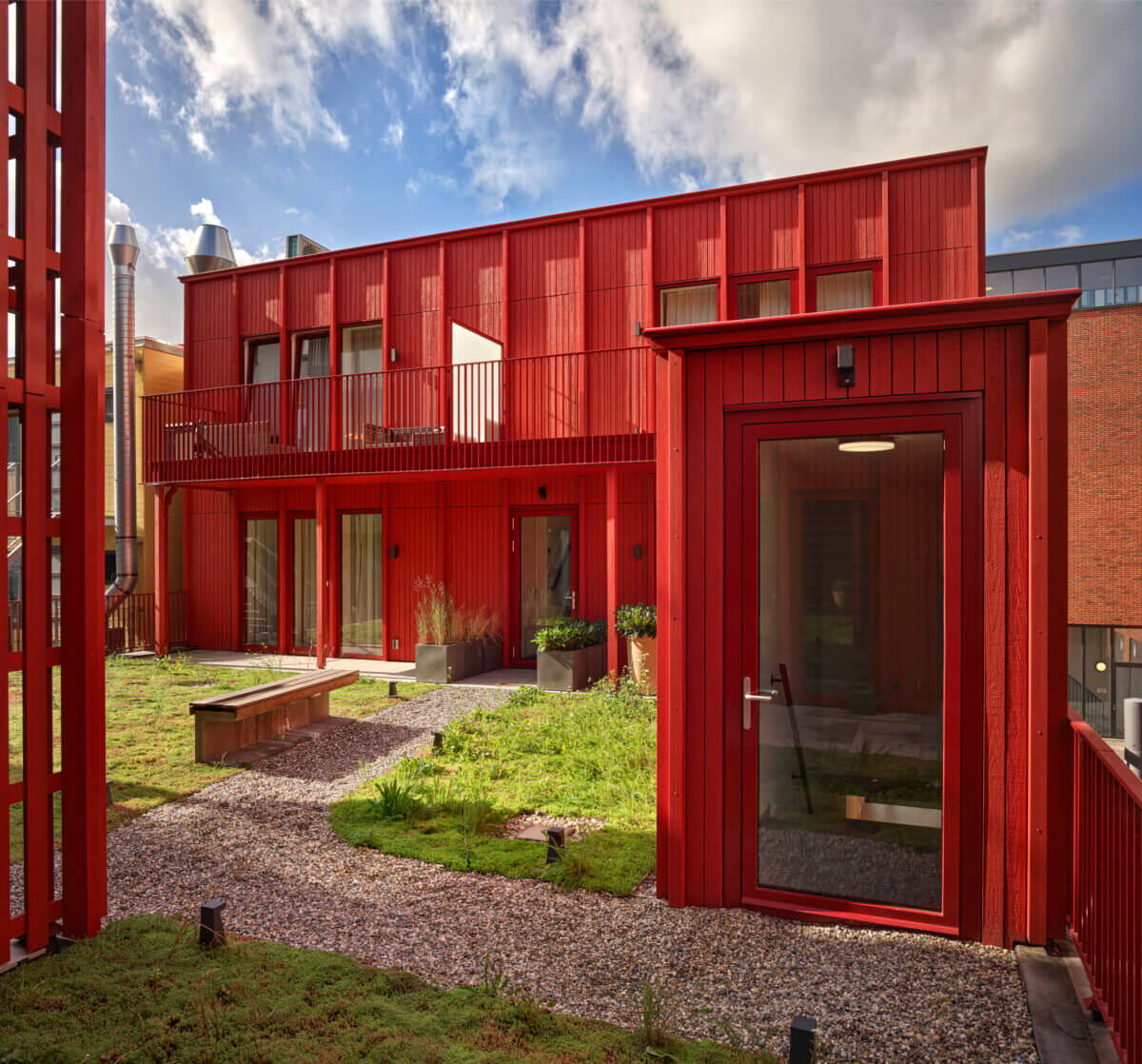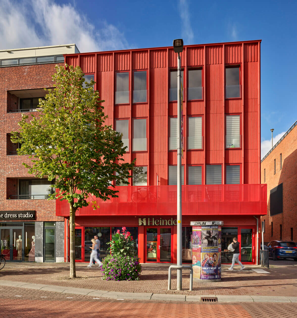 Dit nieuwe prachtige gebouw bestaat deels uit rode houten latjes en langwerpige ramen. Een trap leidt vanaf de begane grond naar het dak van de winkel. Daar ligt een binnentuin en begint de eerste woonlaag. Vanaf daar zijn alle voordeuren te bereiken. Van de tien vrije sector woningen zijn er vier met een oppervlakte van ongeveer 50 vierkante meter. De oppervlaktes van de andere zes woningen liggen tussen de 75-80 vierkante meter. De woningen zijn elk voorzien van een ruim balkon en worden hoogwaardig afgewerkt. De commerciële laag van het gebouw is nog niet opgeleverd. Het achterste deel van de eerder bestaande winkel is gebruikt voor de realisatie van een fietsenberging, een trap en een algemene ruimte. Het ontwerp van Ronald Janssen Architecten geeft de hele straat meer cachet.